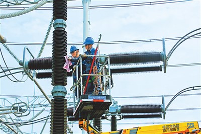 南方电网玉林供电局500千伏美林站美久甲线是广西“四横三纵”主网架的骨干输电线路,是北部湾沿海城市间的重要电力通道,为广西加快地区新型工业化进程提供充足的电力支撑。图为近日电力工人正在对美久甲线开展春季检修工作,保障电力可靠传输。
