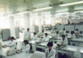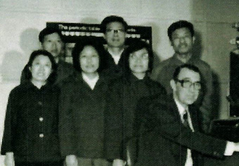 1979年,国外技术人员为高温合金研究室安装透射电镜EM400提供技术服务(前排右—为高温合金材料和冶炼专家陈国祥)。